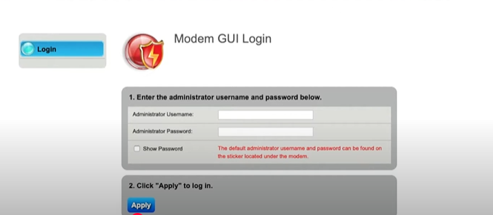 Now that you’re on the login screen, you’ll be asked to enter a username and password. If you haven’t changed them previously, then you can use the default login details printed on a sticker on the back of the router. But if you have made changes in the past, then use the updated information instead. After entering the credentials, hit the Apply button.