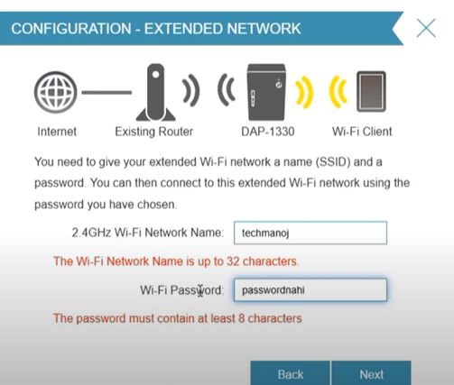 5. You have to create an WiFi name and password for the extended network. The password must be at least 8 characters. Then click Next.