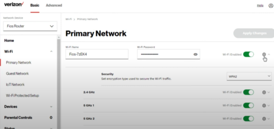 - On the main menu, select Basic>Wi-Fi>Primary Network.