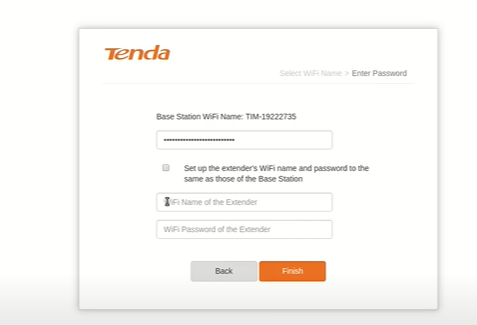 On the WiFi Name of tthe Extender field, enter your new WiFi name. In the WiFi Password of the Extender field, enter your new password, then click Finish.