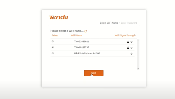 After that select the WiFi name you want to extend then click Next. Enter the WiFi password of the SSID name you selected.